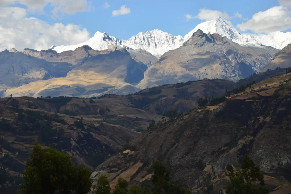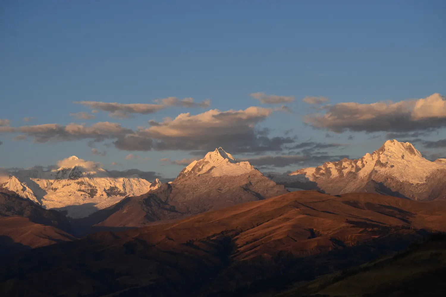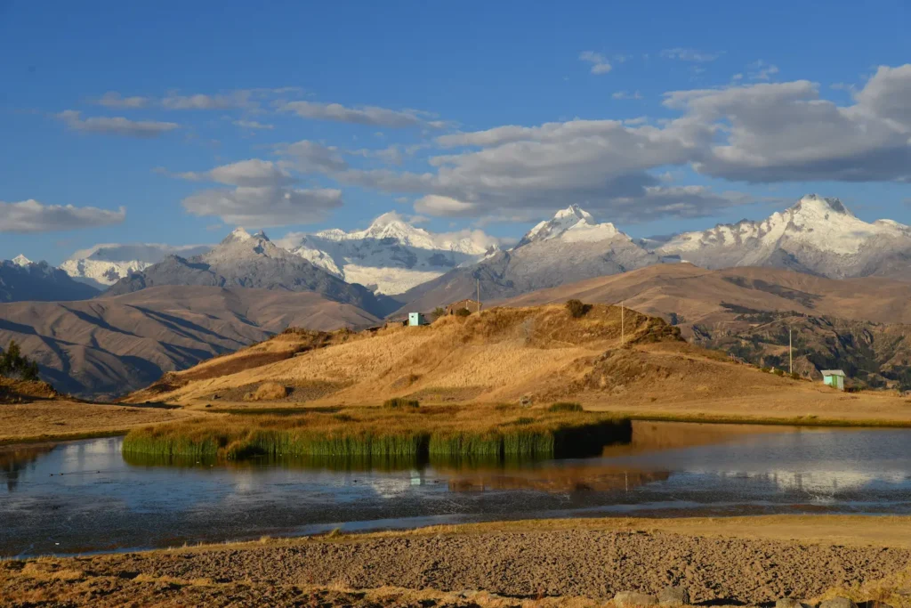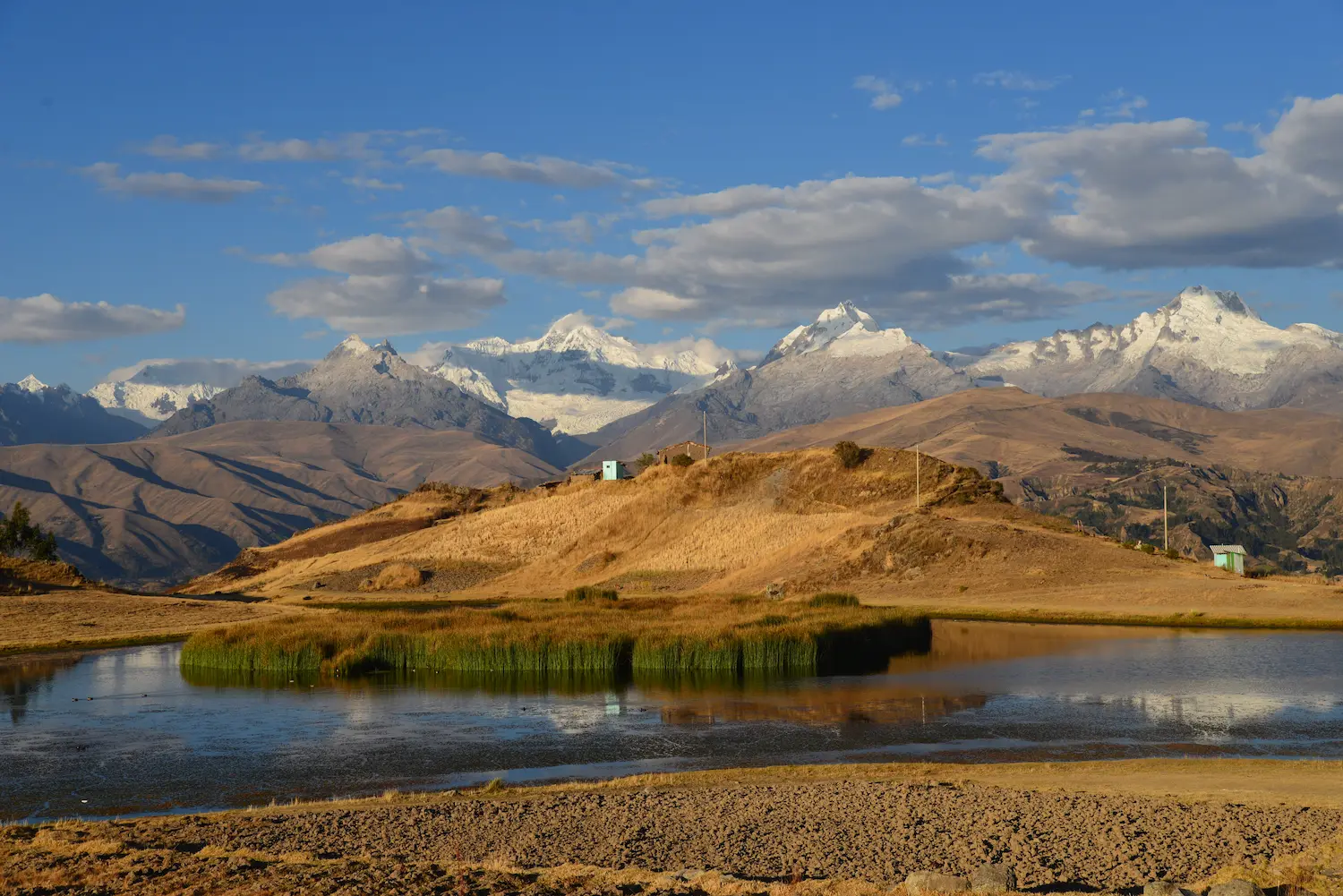 Driving to Rumichuco Bridge, located 20 minutes from Huaraz, the hike starts right off the road, after crossing a bridge to the other side of the river. We will begin a gradually ascending hike toward Ararcocha and Wilcacocha Lakes. The ascent takes around four hours. As we hike, we’ll come upon the towering snow-capped peaks of the Cordillera Blanca, one after the other, including Peru’s highest mountain, Mt. Huascaran, standing at 6768 m (22,204 ft). Along the way, we’ll pass traditional adobe houses surrounded by verdant farmland and observe the vibrant high mountain wildflowers of the Peruvian Andes. With any luck, we’ll have the chance to greet some local Quechua people wearing their traditional colorful garb.